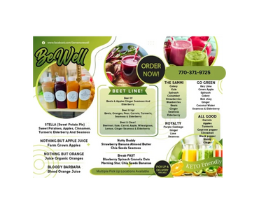 Be Well is our all natural, flavorful and delicious juicing brand. We customize juices for you, even if you don't have any health challenges, and you just want to life and drink to heal. Healthy meal plans are also available.